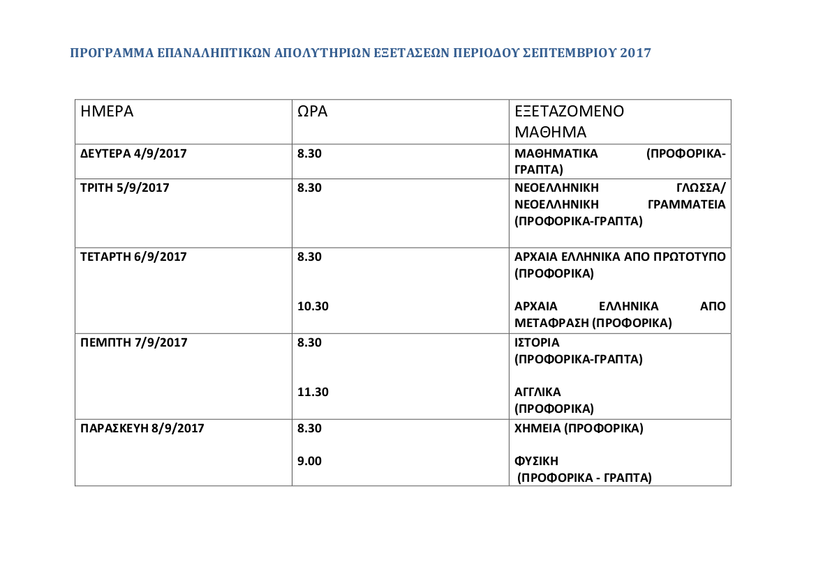 ΠΡΟΓΡΑΜΜΑ ΠΑΡΑΠΕΜΠΤΙΚΩΝ ΚΑΙ ΕΠΑΝΑΛΗΠΤΙΚΩΝ ΕΞΕΤΑΣΕΩΝ ΙΟΥΝΙΟΥ 2017